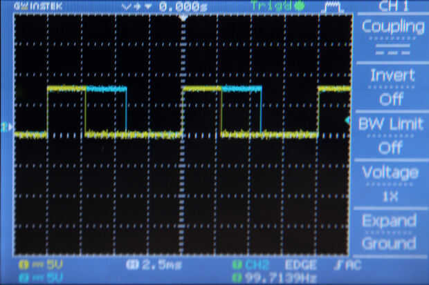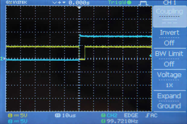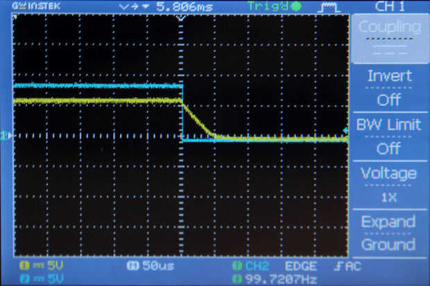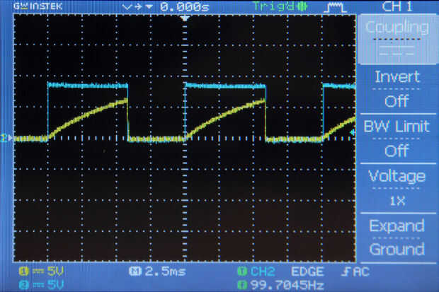 Figura 5 muestra la salida del Temporizador 555. Se puede ver que la duración del pulso alto es 5.6ms, como se esperaba. Observe también cómo un nuevo pulso se activa cada 10 ms, cada vez que la señal de las gotas de Arduino bajo. Figura 6 muestra la salida del 555 en azul y la salida del pin digital de Arduino 0 en amarillo. Se puede ver que la señal de Arduino es normalmente alta, que cae bajo para una pequeña fracción de un segundo, sólo visible cuando nos acercar en el tiempo/div en la figura 7. En la figura 7 puede ver que la señal de las gotas de Arduino bajas para menos de 5us y la salida de los 555 inmediatamente va alta. Fig 8 muestra la salida del 555 en azul y el voltaje en el condensador de 1uF (también el voltaje del pin 6). Observe cómo la salida del Temporizador 555 cae bajo cuando el voltaje en el condensador = 2/3Vcc (en este ejemplo estoy usando una fuente de la batería de 9V, así 2/3Vcc = 6V). Cuando la salida de las gotas 555 baja, provoca el descarga pin (pin 7) Descargar rápidamente el condensador de 1uF. La Fig 9 muestra un primer plano de esta descarga ocurre, puede ver el voltaje a través de la gota del condensador de 2/3Vcc a 0 en acerca de 50us.