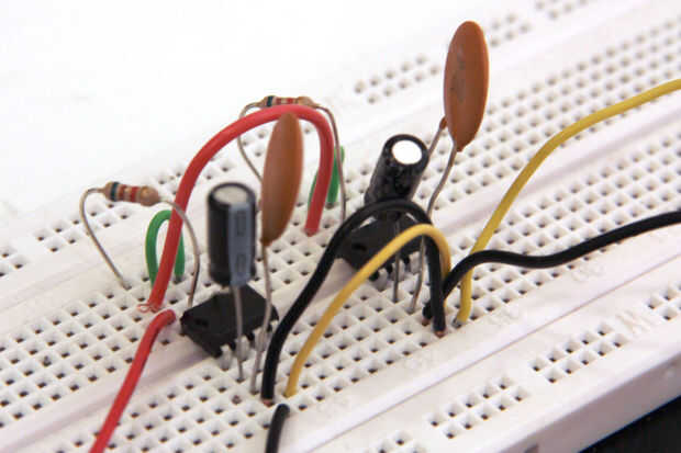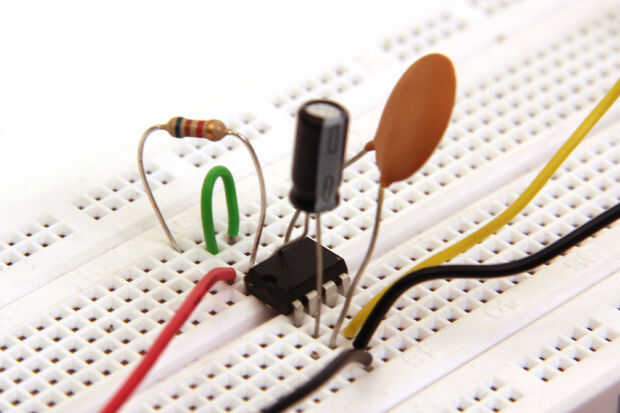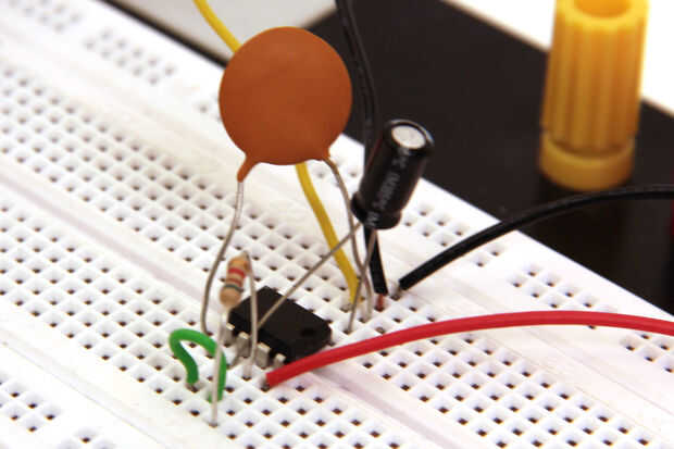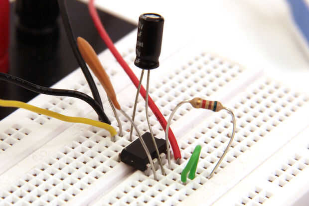 Higos 1-3 muestran cómo conectar el 555 hasta en un protoboard. Conecte la alimentación y tierra a los pines 8 y 1 del Temporizador 555 (cables rojo y negro). Usé un complemento de fuente y batería de 9V para mi circuito. Como se indica en el esquema en la figura 4, conectar un 0.01uF condensador entre los pines 5 y 1. Conecte un condensador de 1uF entre los pines 1 y 6, asegúrese de que el cable negativo del condensador está conectado a la clavija 1. Conecte los pines 6 y 7 con un cable de puente (verde). Conecte un resistor de 5,1 K entre los pines 7 y 8. Salí de la flotación de pin de reset.