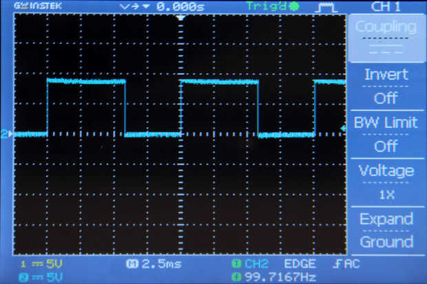 Usé un Arduino para disparar un pulso bajo cada 10ms al pin 2 del 555 temporizador. También puede usar un generador de funciones para generar esta señal de pulso. Aquí está el código que usé: