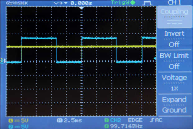 Puesto que este pulso ocurre en una escala de tiempo mucho más rápida y luego en el ultimo paso, he utilizado un Arduino para pin 2 del 555 temporizador bajo cada 10 ms y medir la salida del 555 en un osciloscopio. Aquí es cómo puedo configurarlo: