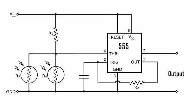 Los dos sensores de luz están cableados en paralelo. Estos están conectados en serie con una resistencia fija. Juntos hacen un divisor de tensión. Cuando cualquiera de los sensores de luz se pone en la sombra (en el coche conduciendo sobre él), su resistencia aumenta. Esto hace que la tensión en el pin 6 para ir por encima del umbral de referencia. Cuando esto sucede la salida en el pin 7 se conecta a tierra y activa el temporizador.