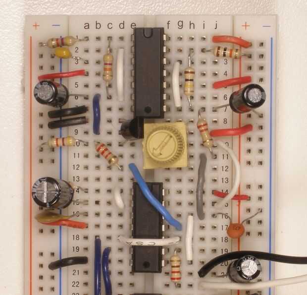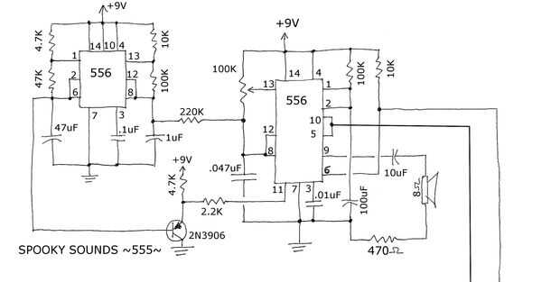 quería hacer sonar ese clásico fantasma de la B-movie, una baja de warbling "Oooooohhh" a menudo escuchada en Scooby-Doo. Hay tres oscilaciones que componen el sonido. Primero hay el tono de Zombie lamentos sí mismo, entonces hay el Vibrato escalofriante y, a continuación, el gorjeo espeluznante. Un mal tono es fácil con el 555 en A-estable, como la mayoría de ustedes ya sabe, pero de alguna manera agregar dos más insinuaciones sobre el Zombie de lamentos... He cavado alrededor 555 circuitos de sirenas en línea y uno para obtener la parte espeluznante gorjeo del circuito sintonizado. Se basa en numerosos ejemplos de trucaje. Puesto que el sonido de gorjeo espeluznante provenía de conducción el voltaje de Control (pin 11) de mi oscilador Zombie lamentos, jugaba con los por un tiempo, en vano. Después de rascarse la vieja noggin, había construido el oscilador Vibrato escalofriante y simplemente había atado de varias partes de él a diversas partes del generador de tono de Zombie de lamentos. Ensayo y error me llevan a descubrir el gran efecto de conectar el dos/umbral de disparo junto con una gran resistencia (menor que 100 K no funcionan así. Adelante, pruébalo). No he probado lo de alcance (todavía), así que no sé lo que está pasando el infierno, pero hot damn! ¡ Funciona!