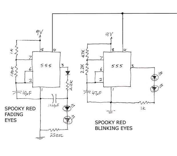 Los ojos de descoloramiento Spooky utiliza un oscilador de relajación RC a desvanecerse y apagar un par de googlies. Me estoy volviendo pesadillas ya!