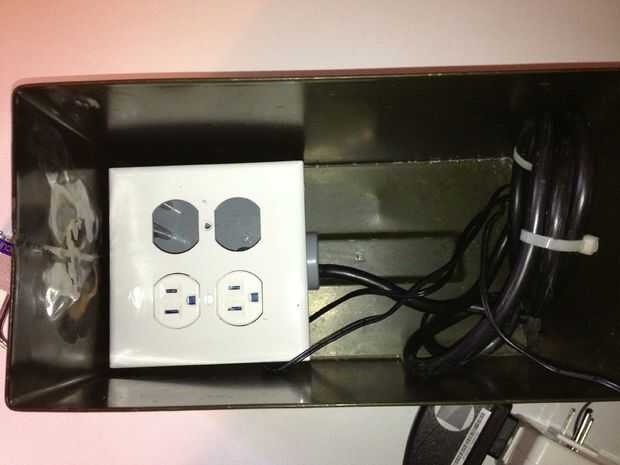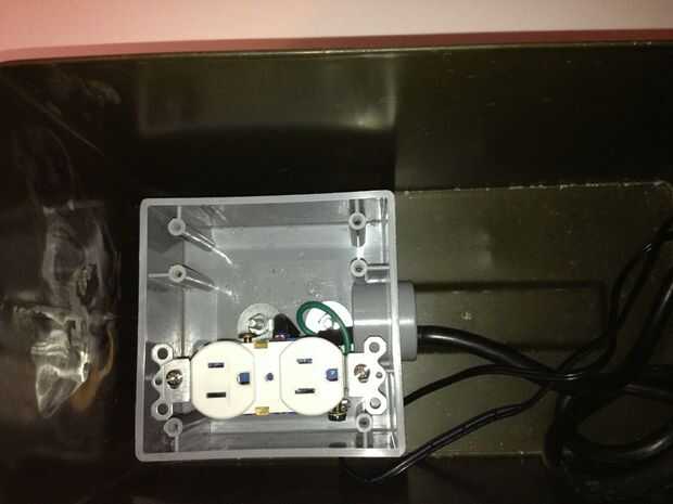 El cable de alimentación a través del orificio en la parte posterior de la caja y el cable del receptáculo. Colocar la tapa del receptáculo.