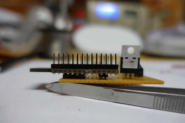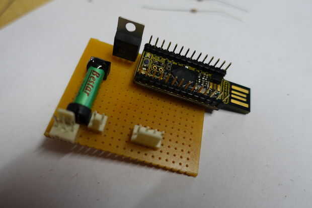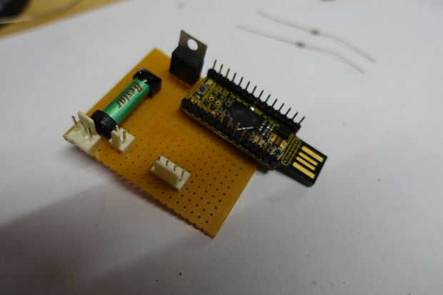 El Freetronics Leostick se monta con su cabecera ICSP (que no tengo que usar). Basta con asegurarse de que al hacer esto los pernos no están cortocircuitadas juntas. La sección USB sobresale por la Junta para ayudar a la conexión dentro de la máquina (sólo en caso de que quiero actualizar el software en algún momento). Los otros componentes se encontraban bastante al azar!