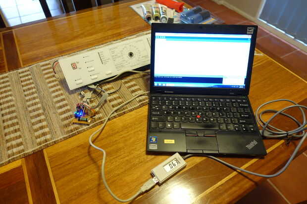 Cuando se cierra la puerta de la máquina y la potencia se aplica el Arduino botas arriba en unos segundos. El tiempo de cuenta regresiva por defecto es 8 hrs y la cuenta regresiva comienza inmediatamente. IE: si puedo cargar la lavadora a 21:00 entonces comenzará a 5:00.