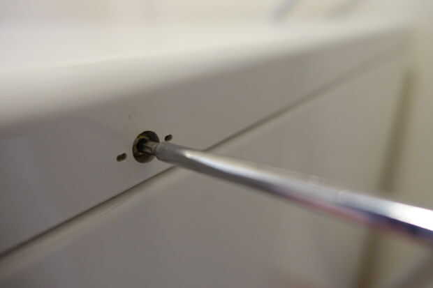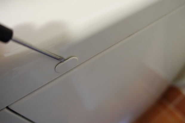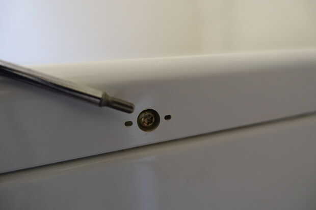 1) sólo quitar palanca/las tapas de plástico que cubre los 2 tornillos torx 1 a cada lado de la máquina. Quitar completamente dos tornillos de torx