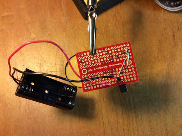 Cuando haya terminado de soldar, cuidadosamente Inserte el chip Attiny programado de su toma y coloque las pilas en su soporte.
