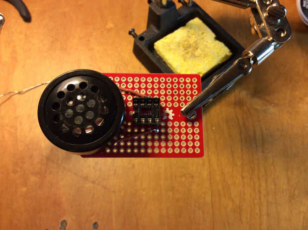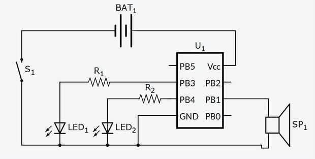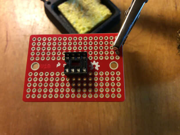 Para comenzar con, soldadura del zócalo del IC en algún lugar en medio de la PCB. Que tenga en la cinta hacia abajo. Luego de la soldadura en el altavoz piezoeléctrico, se conecta el positivo a Attiny pin 6 y el cable negativo a tierra (pin 4 del Attiny). Luego, soldar los LEDs y sus resistencias respectivas a Attiny pins 2 y 3.