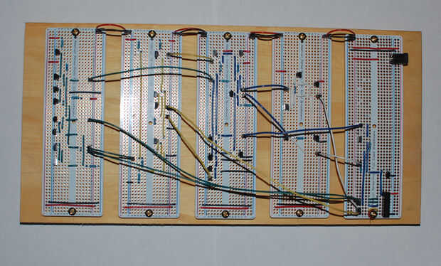 Se trata de un temporizador 555 en un protoboard. El temporizador 555 es una viruta del IC de 8 pines, pero pensé que sería divertido para construir mi propio en un protoboard. Hay cinco secciones para el chip, será construido en cinco tableros de Adafruit Perma Proto. El diseño es de un juego de código abierto de Evil Mad científico laboratorios. Su página de producto que incluye información adicional sobre el 555 y una hoja de datos con un esquema, se encuentra aquí. También venden la platina desnuda del kit si usted decide sus propias piezas de origen.