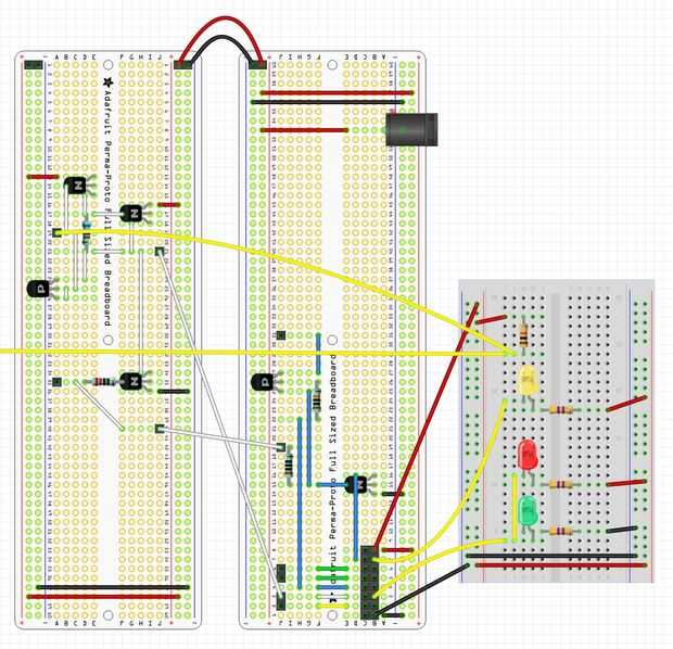 Cuando tocas brevemente el otro cable de la resistencia de 10K al conector en A35 debería apagarse el LED verde y el rojo y amarillo LED deberá encenderse.