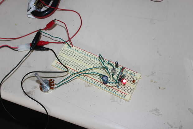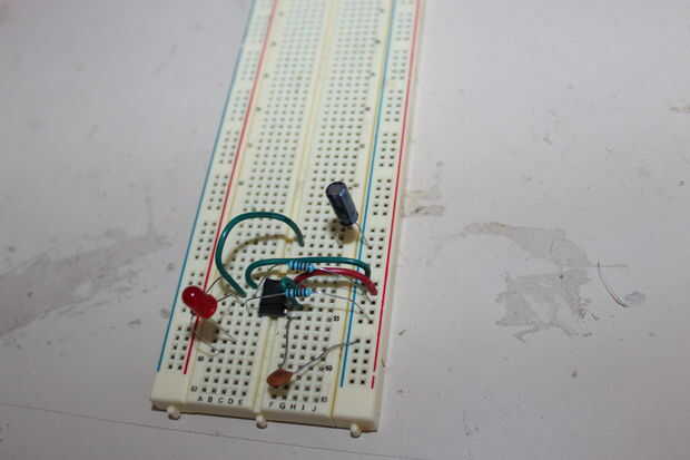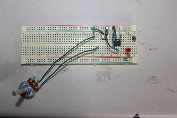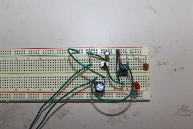 Después de ajustar la resistencia a un valor de prueba, vuelva a conectar el + V para el potenciómetro y enchufe el poder! Con suerte, su LED debe a y vienen después de cerca de 11 segundos. Retire y vuelva a colocar el power un par de veces para asegurarse de que desencadenantes del circuito confiablemente en encendido. Si desencadenar confiablemente, trate de usar un valor mayor del condensador entre el pin de trigger y la tierra y asegúrese de que el condensador esté orientado correctamente (con el - lado conectado a tierra).