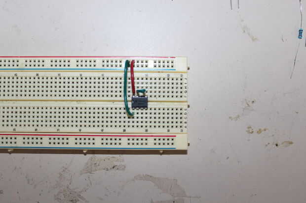 Luego conecte un cable entre el otro extremo de las resistencias a los pines 6 o 7 (ya que estos dos ya están conectados, sólo tienes que conectar a uno de ellos), luego conecte el lado positivo de su condensador grande ese mismo cable, y el lado negativo del condensador a tierra.