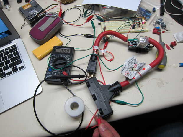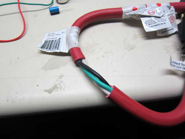 Los tres alambres dentro del cable de extensión probablemente será verde, blanco y negro para tierra, neutro y caliente respectivamente. Usted sólo corte negra. Cortar con el cortador de alambre en el centro y tira lejos suficiente blindaje para fije en el terminal de tornillo con ningún cable desnudo sobresale (Recuerde que se trata de alambre de alto voltaje, y definitivamente no quieres cortocircuito cualquier cosa!). Ahora desea asegurarse absolutamente de que el cable negro es el hilo. Utilice el multímetro en modo de resistencia para medir la resistencia a la clavija. Debería ver que el alambre que sólo va a uno de los dientes de la hoja, no la pata de la tierra. No importa cuál, pero si va a la patilla de toma de tierra, su servidor no funcionará y la Asamblea será sin conexión a tierra.