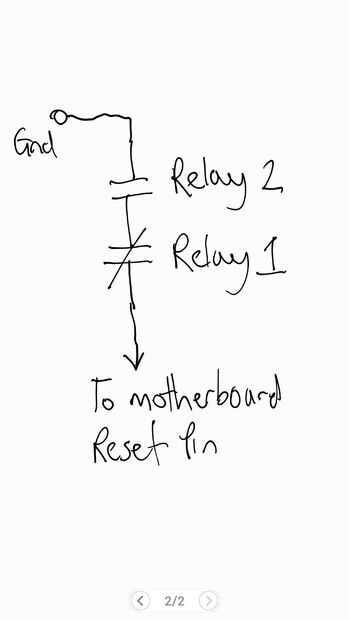 La tercera foto le da el cableado de los contactos del relé. El pin de reset en una placa base es activo bajo (0v da un reinicio duro). Alambré la salida al pin de reset.