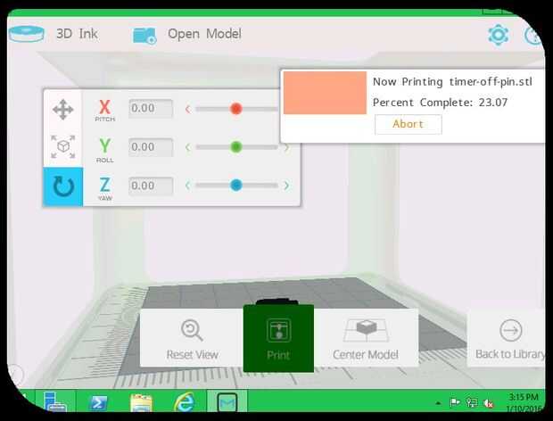 Inicie el software de M3D si no lo has hecho ya para la calibración. Seleccione "Modelo abierto" y seleccione el fichero .stl para el disparador apagado desde el archivo zip incluido. Haga clic en imprimir. En la pantalla de opciones, asegúrese de que la única opción que está seleccionada es "Uso balsa." Comenzar la impresión.