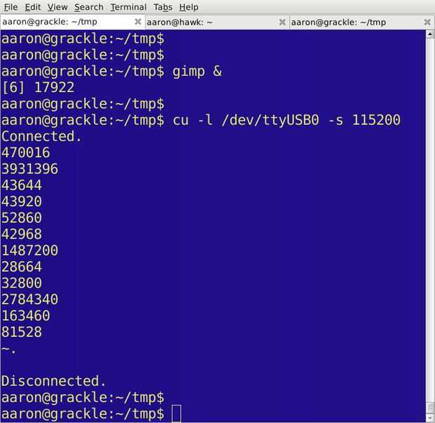 Si se desea monitorizar la salida utilizando el IDE de Arduino Serial Monitor, hay muchas maneras de comunicarse con un puerto serie. En Windows el programa putty tiene la capacidad de comunicarse con el puerto serie. El puerto serie de Arduino utiliza valores predeterminados típicos, como el 8-N-1, por lo que el único ajuste necesario es la velocidad en baudios de 115200. En LINUX yo prefiero:
