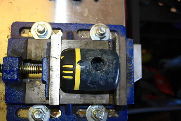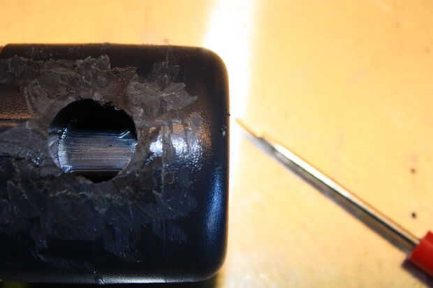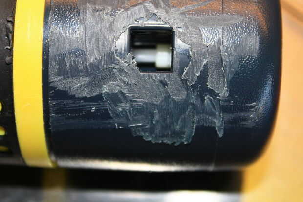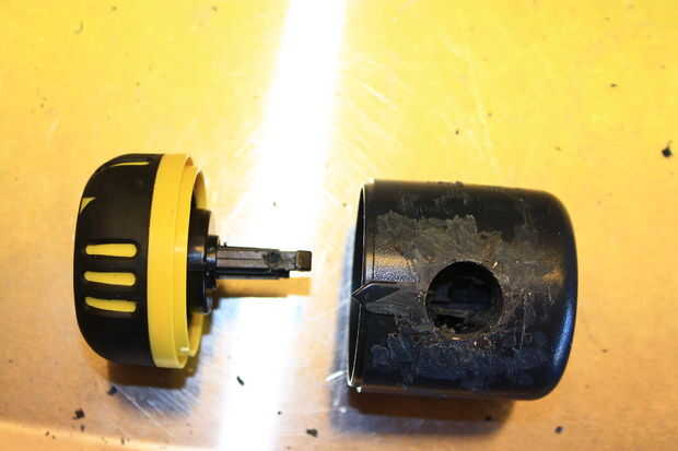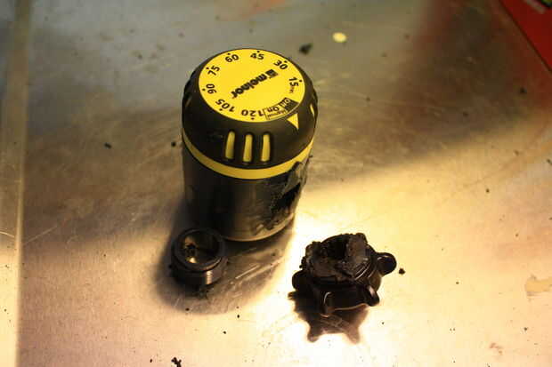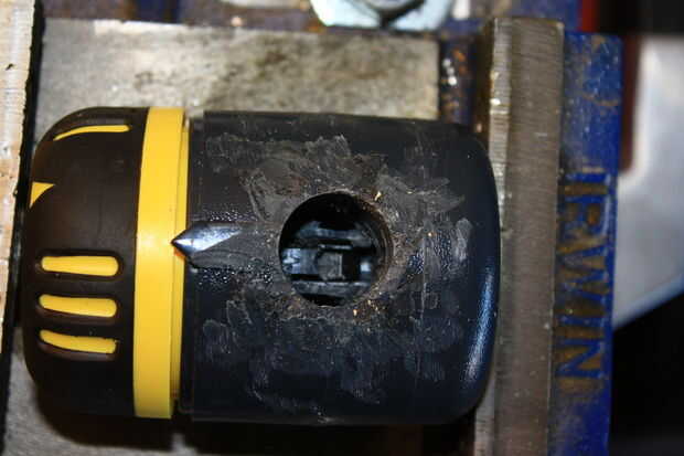 El siguiente es quitar el tapón amarillo que contiene el mecanismo del temporizador del gris del cuerpo de válvula. En este modelo, se ajusta en fábrica y simplemente no está diseñado para ser quitado sin un poco de destrucción. Si nos fijamos cuidadosamente en uno de los agujeros a la izquierda de los conectores de manguera quitado, verá un bloque vertical de plástico dentro - es donde se recorta la espiga de fijación de la tapa amarilla en. Tomando una pequeña broca cuidadosamente perforados una ranura hasta que golpeó el poste de fijación dentro. Tomando un pequeño extractor del sello o enganchado lezna, enredarse el picaporte y tiró de él hacia ME, soltar el post cierre y permitir que la tapa amarillo temporizador para quitarse.