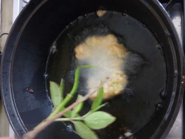 La batterd de la floración en el aceite caliente de la inmersión.  Mantener la mano del tallo y la floración en pequeños movimientos bruscos al mover hacia arriba, hacia abajo y todo en orden te separe las flores. Si no lo hace, el la masa se agrupan para arriba en una bola grande.