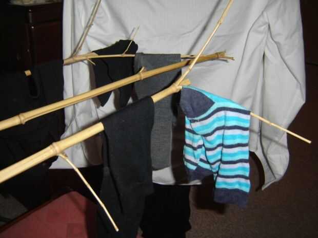 tienes que amar a este diseño. Es compacto, es robusto y es genial! Ir a la fuente.Esta rejilla de secado se basa en suspender dos triángulos concéntricos, equiláteros para hacer seis secciones transversales para colgar moje la ropa o toallas durante