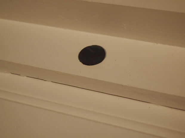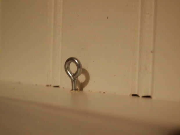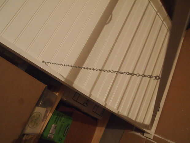 Prueba del marco, sacar la rejilla de secado en el ángulo deseado. Mida la longitud de un ojo de tornillo en la montura posterior tornillo de ojo en la rejilla de secado. Cortar la cadena de este y fije (fuimos con 18"). Corte la segunda pieza de la cadena a la longitud del mismo y adjuntar los otros ojos del tornillo.