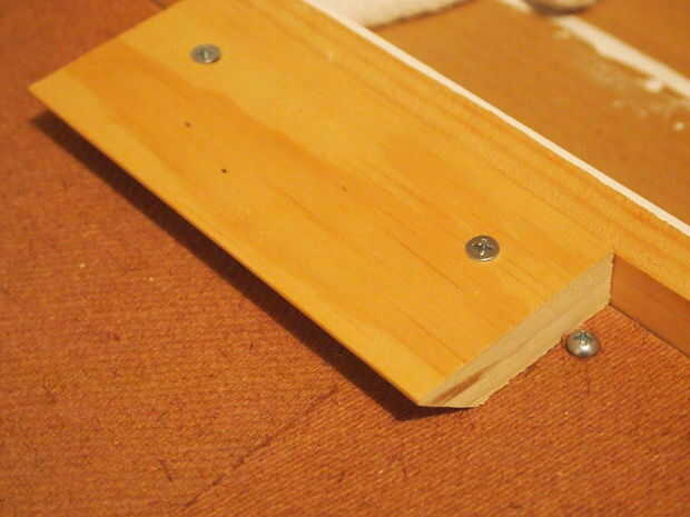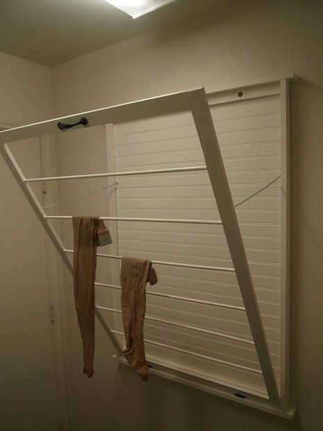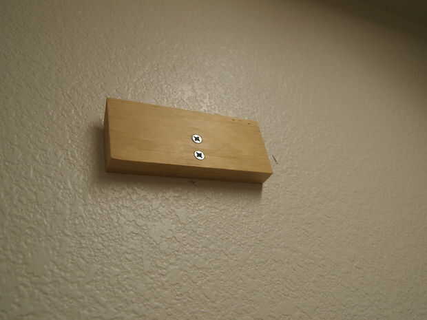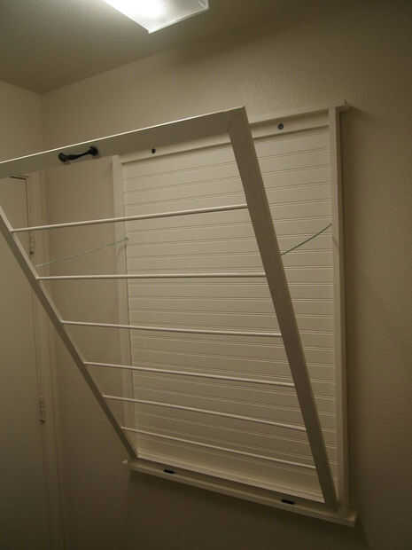 Con un buscador de birlos, encontrar la distancia entre los montantes en la pared. Atornille dos grapas a la parte posterior del bastidor posterior usando esta distancia. La superficie angular debe ser hacia abajo, con el lado corto contra la rejilla de secado.