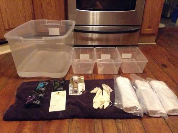 Tener un par de otros envases de plástico de alrededor ayuda a apartar un corsé al cambiar colorantes... toallas de trabajan demasiado.