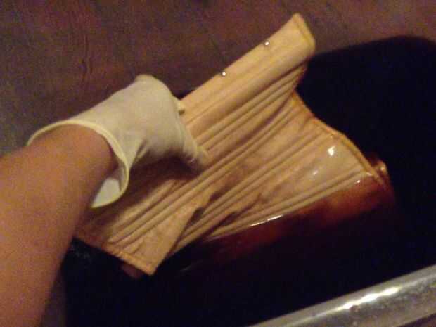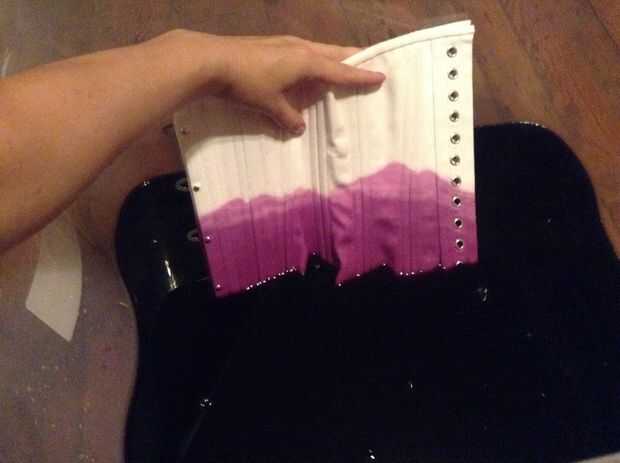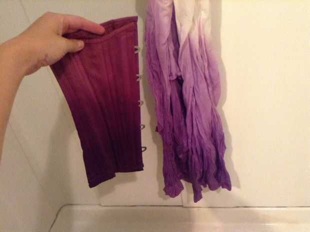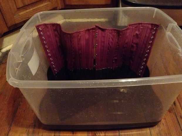 Una vez acabado teñido. Enjuague el corsé en la ducha para eliminar el exceso de tinte y deje que se seque durante la noche.