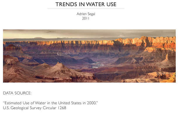 TENDENCIAS en el uso de agua es una escultura de datos que visualiza estadísticas de consumo de agua nacionales en los Estados Unidos más de 50 años, entre 1950 y 2000. El ancho de las paredes del cañón se determina por la cantidad de agua consumida y cada río o afluente representa una categoría específica del uso del agua basada en el informe USGS; Termoeléctrica energía, riego, Industrial, fuente pública, nacional y minería/acuicultura/ganado/Rural (combinado). La forma del cañón como se ve desde arriba se deriva de un mapa del río de Colorado en su totalidad y es el principal afluente, el río verde, así como tres tributarios más pequeños - son responsables de toda el agua (dulce y salina) retirado en Estados Unidos cada día: 408000 millones de galones.
