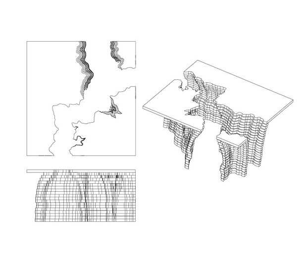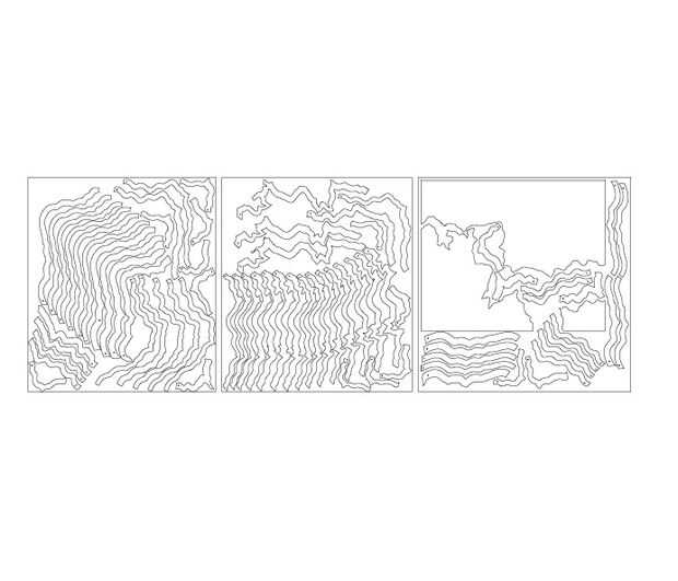El proceso de traducir datos de números en formas es complejo. Estas imágenes muestran un modelo de computadora de la escultura final construida con capas de material de la hoja. Las piezas se extraen entonces el modelo y pueden ser cortadas con precisión.