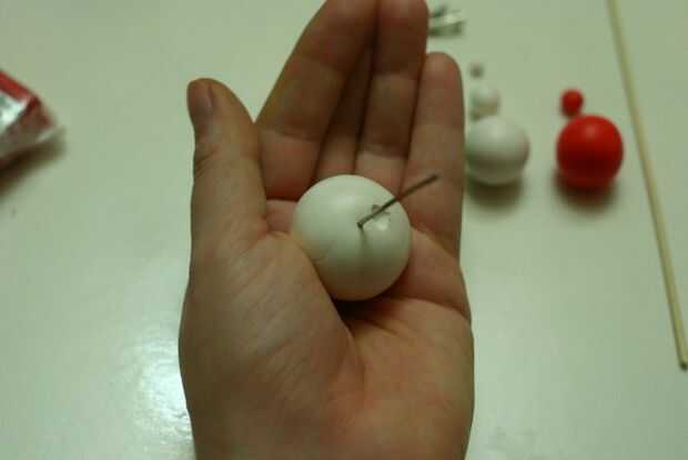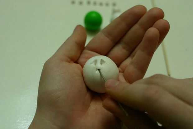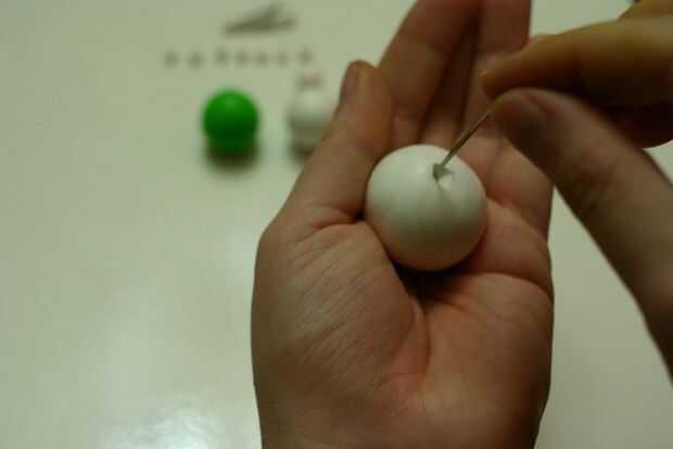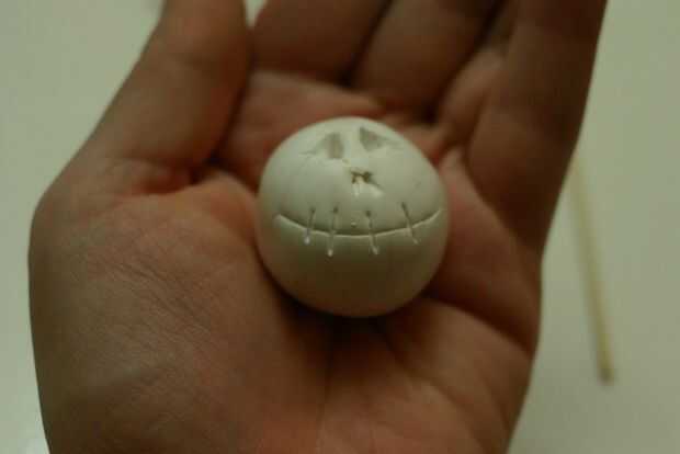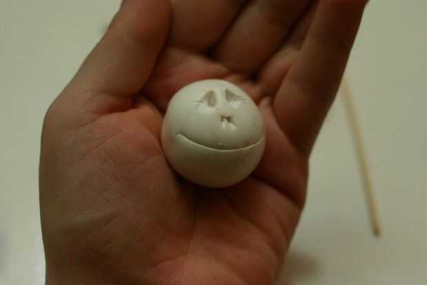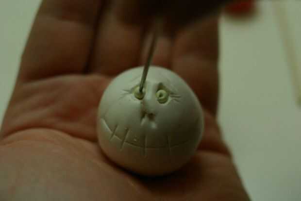 Después de eso, tome dos de las pequeñas bolas blancas con la aguja (haciendo pequeños agujeros en ellos) y ponerlos en las tomas como se indica. Si tienes arcilla polimérica brillan en la oscuridad, puede hacer los ojos de él, para el efecto añadido.