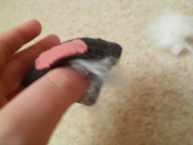 Ahora necesita usted rellenar orejas. Usé un juguete relleno, que se puede obtener de hobbycraft (Reino Unido) por debajo de £5 - http://www.hobbycraft.co.uk/hobbycraft-soft-toy-filling-250g/567212-1000 llenar uniformemente y asegúrese de que usted introduzca hasta la parte superior. Si les llena muy rígidamente, defienden más y enfrente pues si llenan ligeramente. Ahora coser el espacio con una puntada de manta y ate.
