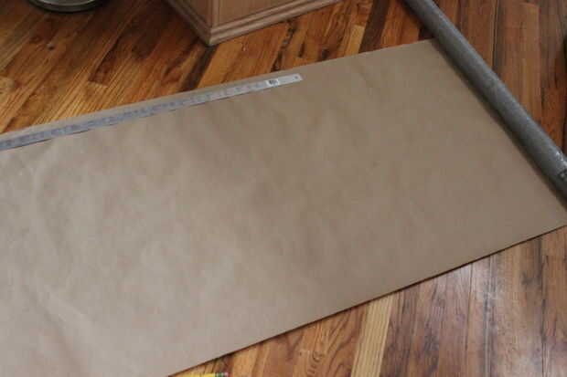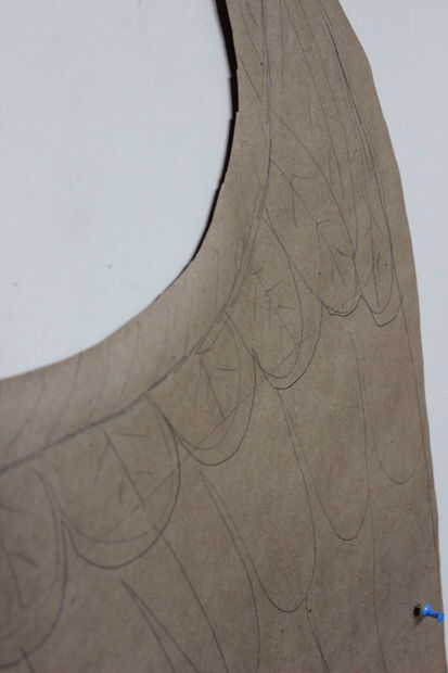 Para empezar las alas, hice un boceto a mano alzada en un pedazo grande de papel marrón de un correo electrónico. Fue en un carrete y muy rizado, así que tuve que pesar abajo con lo que he podido encontrar alrededor de la casa (que en mi caso eran pequeños plegable bandejas de TV...)