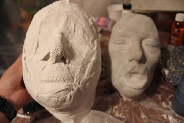Una vez que tuvimos el alginato en mi cara, en el vino el yeso vendas. Estas fueron sumergidas en agua caliente para acelerar su tiempo de secado. Sólo tenía mis agujeros de la nariz para respirar por unos 15 minutos. Realmente no fue demasiado desagradable - solamente el 2do intento fue - alginato mantuvo recibiendo hasta mi nariz y no estaba muy feliz.