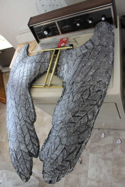 Las alas de un ángel llorando son muy grandes - probablemente cerca de un metro de largo. Como tal, debían hacer algo ligero. Yo había consultado con el dueño de FX especiales en North Salt Lake, y sugirió usar una armadura de alambre entre dos piezas de espuma de poliuretano (como la gente buena uso para camping colchones). Miré en eso, pero conseguir un pedazo de espuma lo suficientemente grande y suficientemente delgada sería tipo de fuera de mi presupuesto (como tendría que comprar 4 piezas que eran por lo menos 4 pies de largo y 3 pies de ancho...). Así que encontré este material llamado Claycrete cuando estaba en la tienda de artesanía. Esencialmente, es ideal para macheÌ de papel - todo lo que es es pasta de papel y le solo agregue agua. Cuando se seca es blanco puro y es super ligero (perfecto!) Me considero un experto en papel macheÌ en el sentido tradicional (he hecho muchas cosas de periódicos viejos...) pero esto era la primera vez que he usado Claycrete y planeo usarlo otra vez en el futuro. Tarda mucho tiempo en secar - creo que tardó alrededor de una semana para cada ala se seque por completo antes de que pudiera hacer nada más con ellos.