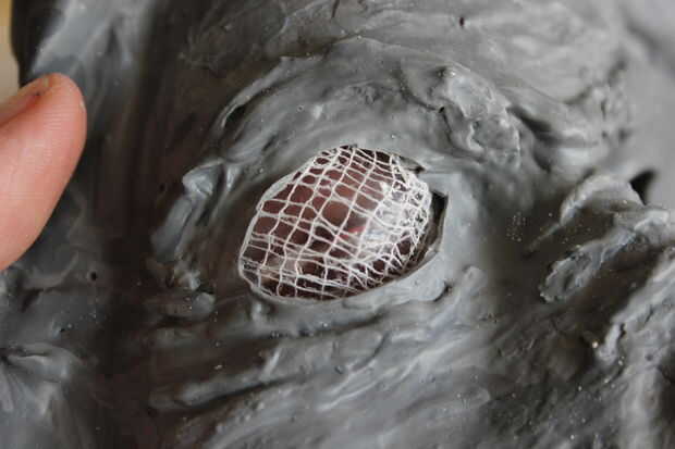 Quité los grandes hemisferios, colocados la tela dentro de la máscara, entonces para mantenerlos en su lugar mientras que se añadió una nueva capa de látex (para actuar como pegamento para adherir el interior de la máscara para el látex en el globo ocular), utiliza un hemisferio #36 para cada ojo y permite seque durante la noche.