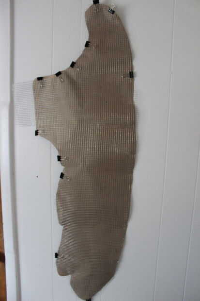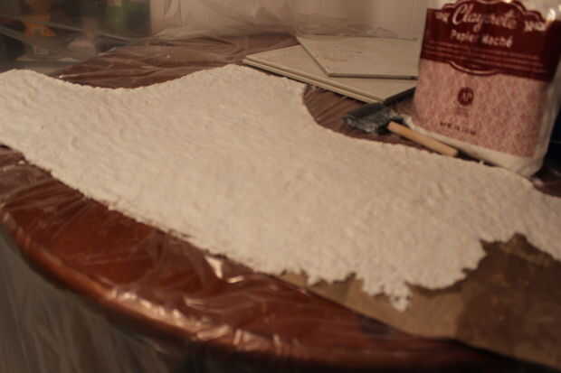 Yo estaba impaciente por empezar, así que aunque las alas fueron un poco rizadas aún en este punto, no me importaba. Deje algunos plásticos y mezclan el Claycrete. He dejado el papel sobre - había iniciado en el lado de papel y difundir una cantidad fina de Claycrete mezclado todo el ala. He dejado el papel sobre porque no quiero perder a ninguno de mi mix a través de los agujeros de 1/4" en el paño del hardware. 2-3 días más tarde, fue lo suficientemente seco como para Dale la vuelta y hacer el otro lado. Repetí el proceso (aunque esta vez el Claycrete se extendió sobre el alambre desnudo - estaba bien porque había papel en el otro lado a coger todo y rellenar los agujeritos al mismo tiempo). Otros 2-3 días pasaron y ambos lados de las dos alas fueron finalmente secos! (¡ YAY!) El siguiente paso fue poner una capa fina de ModPodge para papel en cada lado para fortalecer aún más las alas. ModPodge seca más rápido que el Claycrete, pero todavía tardó un día para cada lado que se seque lo suficiente para empezar a pintar las alas.