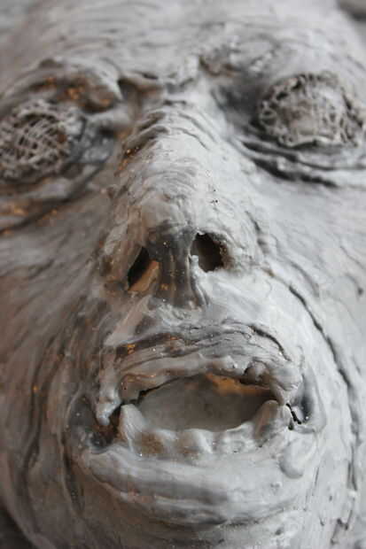 Una vez los globos oculares en el lugar, volcó la máscara y me rocía otra fina capa de almidón del aerosol en la estopilla para endurecer aún más. Una vez seco (unas horas), he pintado los ojos con alguna pintura gris (diseñada para vidrieras...)