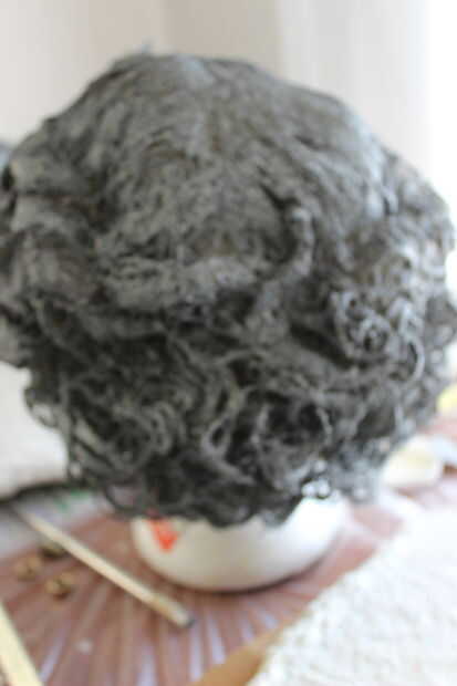 Para el pelo he comprado una peluca rubia barata 1920 estilo. No importa qué color era, recubiertos en latex y luego tomó una lata de hacer que piedra y cubrió la peluca entera con él.