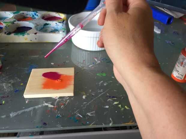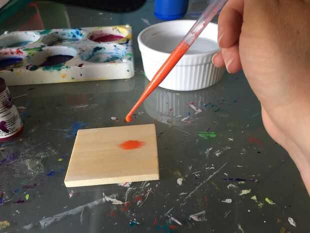 Esto es donde las pipetas vienen en muy prácticos, pero puede también hacer esto con una cuchara o incluso los dedos. La transferencia de un poco de su agua de color sobre la superficie de tu pintura. Puede caer, como aquí y permita que extendido naturalmente o puede manchar los colores alrededor de f que le gustaría ejercer más control sobre él.