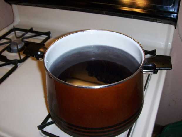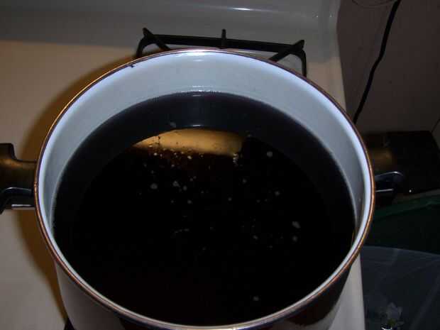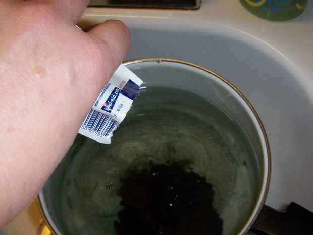 Revolver con cucharón o una cuchara y deje sentarse hasta que la superficie del agua parece que está siendo rociada en (verás poco pequeñas burbujas haciendo estallar en la superficie del baño de tinte, unos 20 minutos).