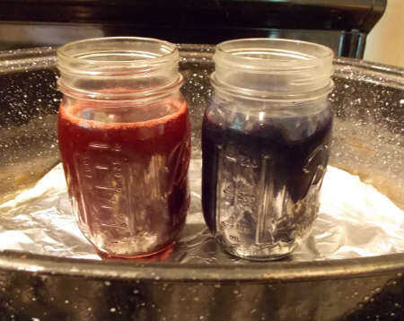 Mezclar sus tinturas según las instrucciones del paquete. Si no quieres mezclar todo el lote a la vez, usar una cucharadita por taza de agua. SIEMPRE use una máscara antipolvo al mezclar el colorante en polvo!!!! Llene cada canning jar aproximadamente 1/3 con agua tibia y añadir una cucharada de vinagre. Luego añadir aproximadamente 1/3 taza de la disuelta carmesí tinte en un tarro y azul en el otro.