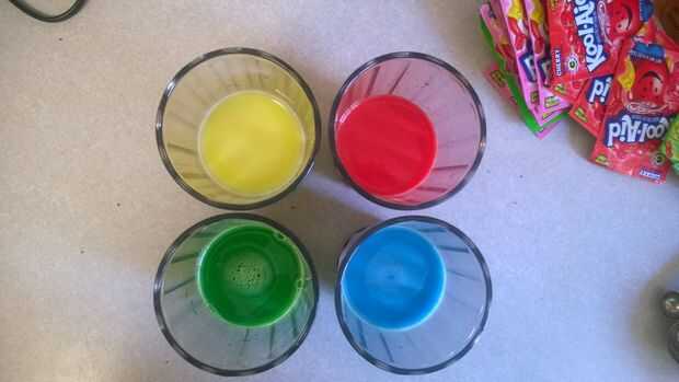 Si usted es lazo de muerte, usted querrá mezclar sus tintes en vasos más pequeños. He utilizado cuatro colores: Sharkleberry Fin, limonada de frambuesa azul, verde manzana y limonada. Utilicé dos paquetes para cada uno, pensando que estaba bien con overdyeing el hilo. Especialmente con este método, mucho preferiría un color más fuerte que uno más débil.