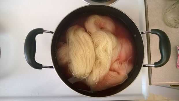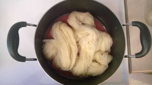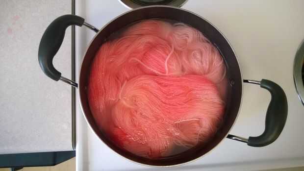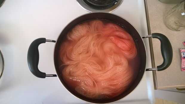 Ahora agregará su hilado a la olla y agregue agua suficiente que el hilo está totalmente cubierto. Puede que tenga que moverse suavemente el hilo para que el tinte cubra todo el hilo y que el hilo está totalmente sumergieron en el agua. Una vez que el hilo está cubierto, a encender la estufa y calentar el agua. La temperatura debe levantarse hasta que casi hierva, así que esperé en todo mío hasta que hubo pequeñas burbujas en el agua, pero no había una ebullición completa. Entonces a tomar lejos del fuego y dejar enfriar. Usted sabrá que está hecho el hilo teñido cuando no hay color queda en la olla (estará ya sea claro o un blanco turbio). Si no está allí todavía después de enfriamiento, calentamiento y deje enfriar nuevamente. Tuve que recalentar todas mi hilo.