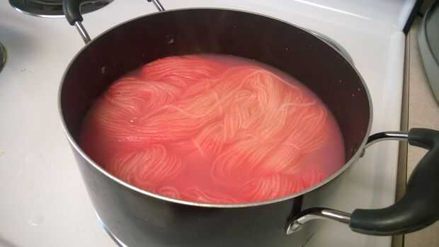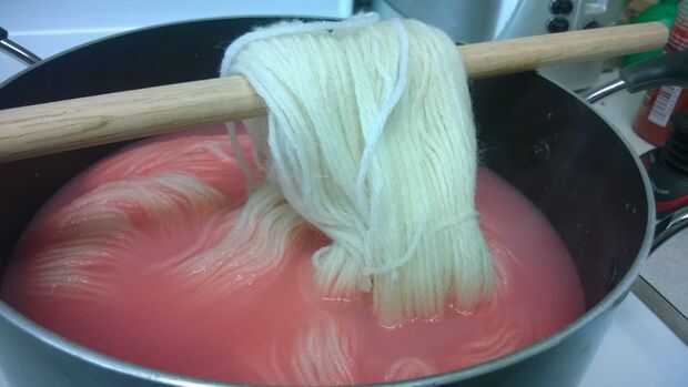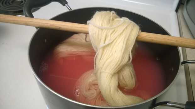Si quieres un hilado más tonal, abigarrado, cuando añades el hilo al medio, mantener parte de él hacia fuera para la mayoría del proceso de calentamiento. Puse una varilla de pasador en la parte superior de la maceta para mantener parte de la lana en el tinte y agregó agua hasta el punto donde quería. Después de calentar el hilo y sacar enfriar, luego pongo el resto del hilo en el bote. Que el hilo enfriar y vuelva a calentar si es necesario.