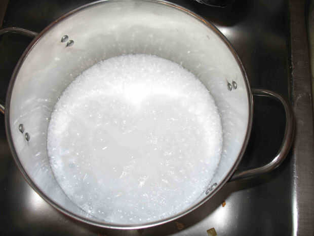 En una olla grande (yo uso un bote de conserva) medio llenar con agua fría. Añadir en el mordaz cuando se disuelve.