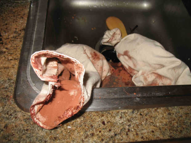 Una vez terminado el baño de tinte, unos dos o tres horas, permita que se enfríe. Tomar las bolsas tinte a exprimir para obtener tanto color como sea posible de ellos.