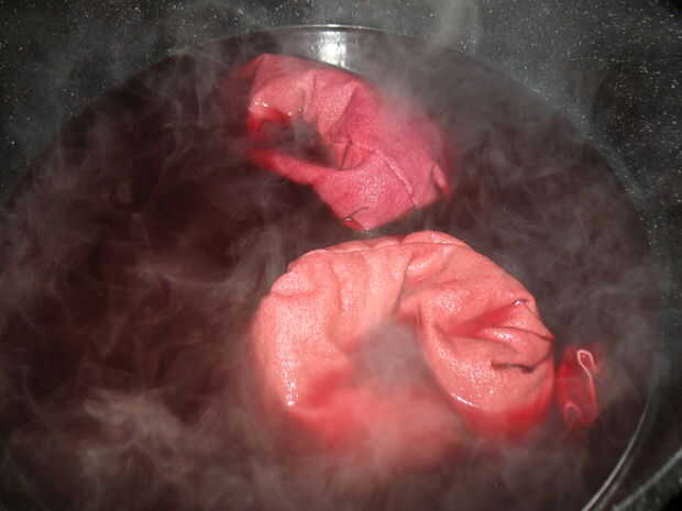 Calentar el baño de tinte a unos 180 grados Fahrenheit (80 grados). NO HIERVA. Punto de ebullición cambiará drásticamente el madder a un color más marrón.