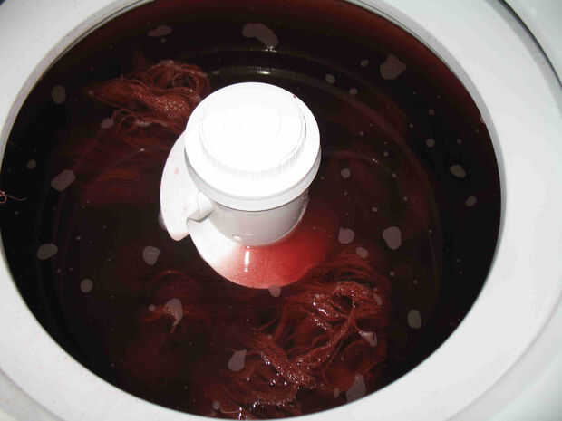 I luego lavar el hilo y enjuague a mano, lavar y enjuagar a mano otra vez y luego girar nuevamente en la lavadora.