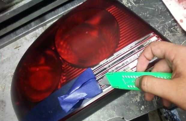 Con cuidado cinta de cualquier porción que no teñida, en mi caso, guardé la reversa y direccionales como estaban.